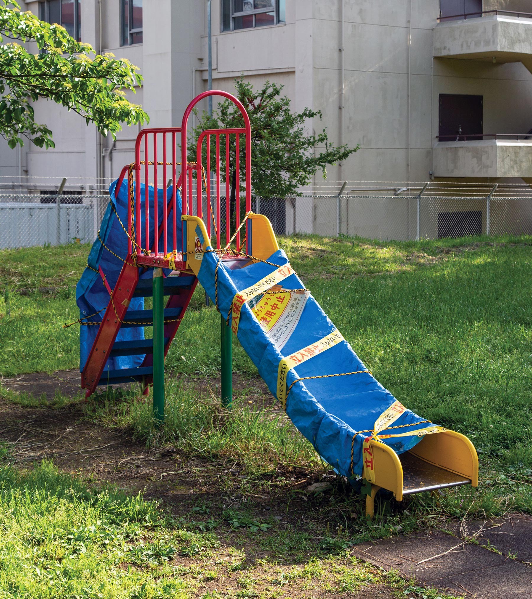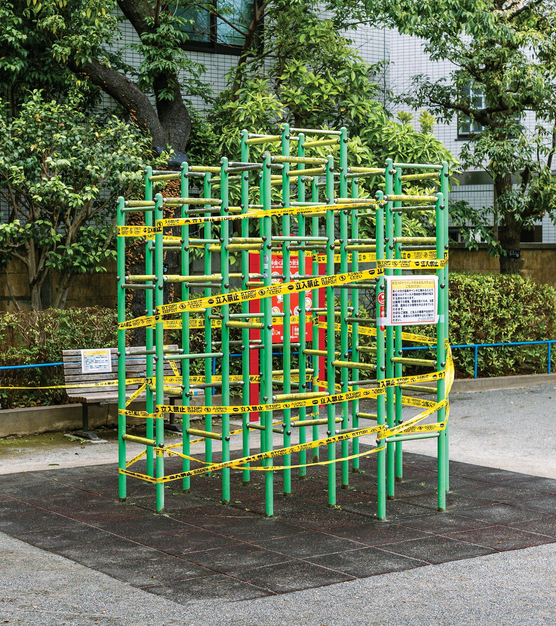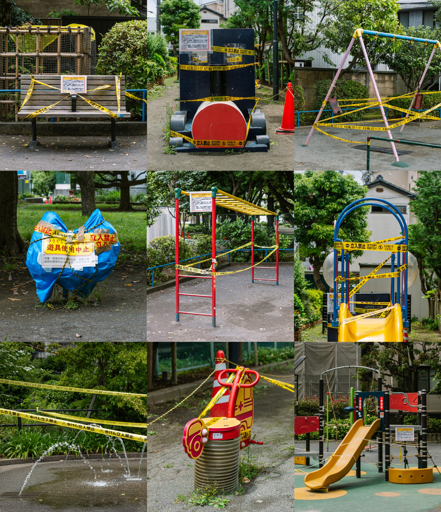 街が自粛期間に入ったばかりの数ヶ月間、東京の公園や遊び場は封鎖されていました。ブランコは黄色いテープで縛られ、滑り台はまるで未完成の彫刻のようにラッピングされていたのを覚えています。