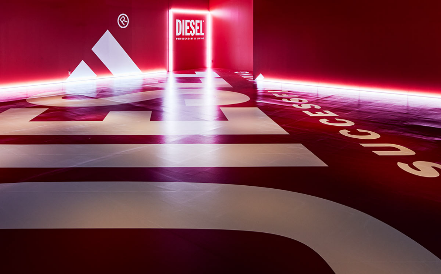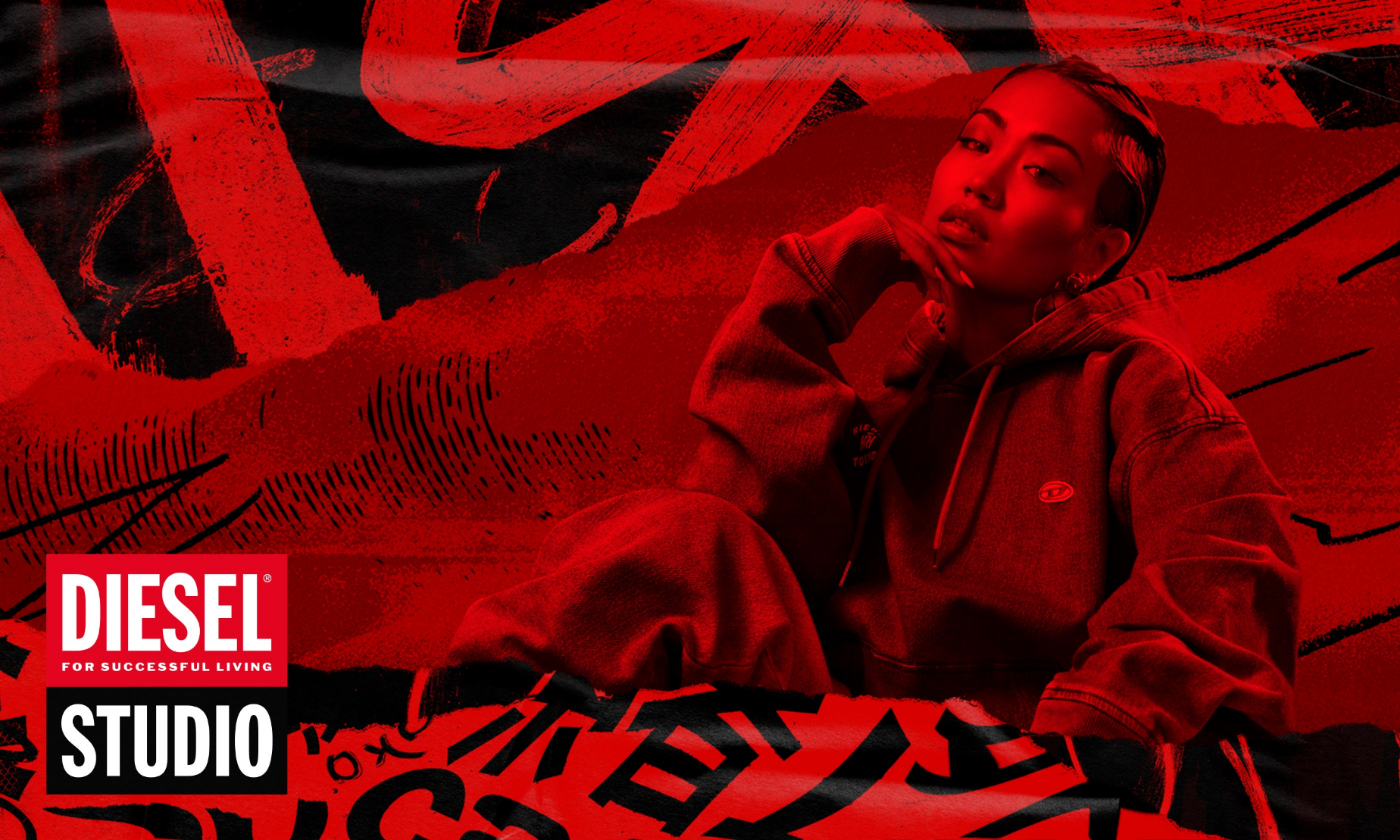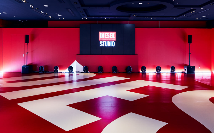 The basement floor is the core space of Diesel Studio, a place for special content transmissions and brand experience. This studio, with its symbolic red walls and mirrors, is the centerpiece of the project, featuring street dance in the first phase collaborating with Rie Hata and e-sports in the second with Fennel. The studio can be experienced both in person and online through collaborations with these inspiring creators who are evolving their respective cultures unconstrained by preconceived notions and transcending genre barriers.